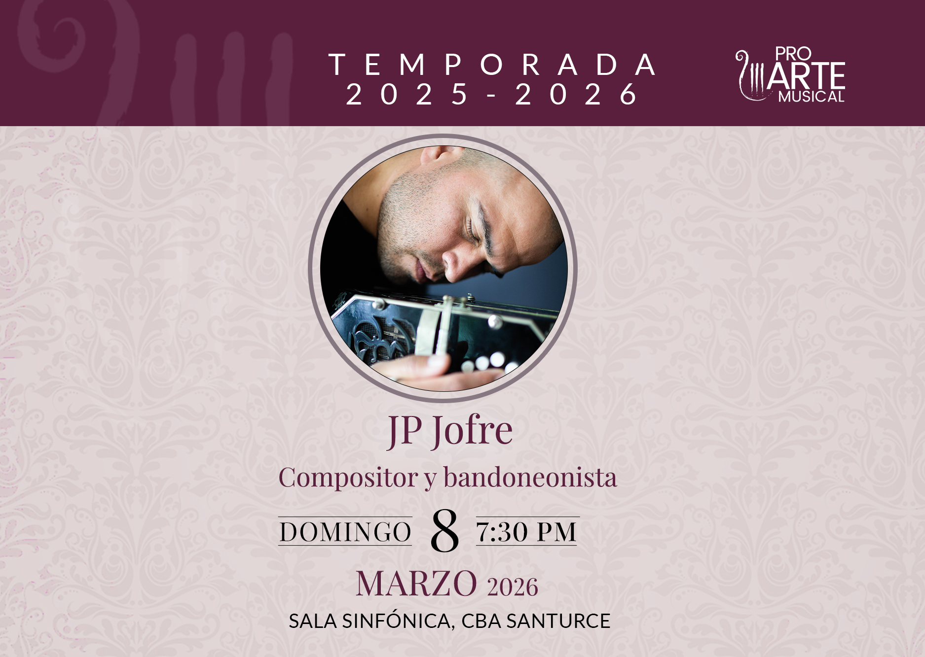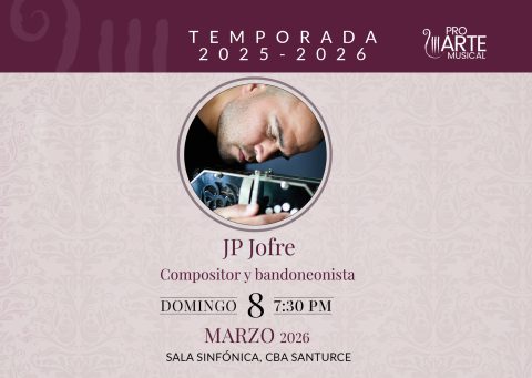 ProArte Musical presenta al compositor y bandoneonista JP Jofre el domingo, 8 de marzo de 2026, a las 7:30 p.m. en la Sala Sinfónica Pablo Casals del Centro de Bellas Artes de Santurce.